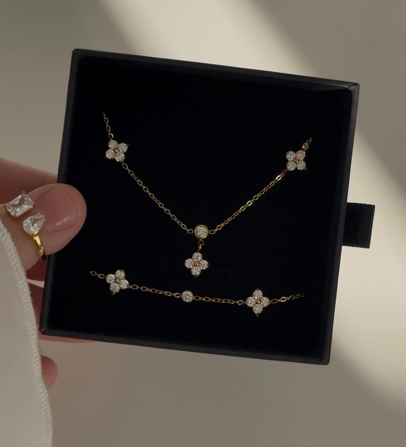 Zart und elegant – das Astrella Set besticht mit einem polierten Goldanhänger, inspiriert von Sternen und Blüten, und verleiht jedem Look einen dezenten Glanz.